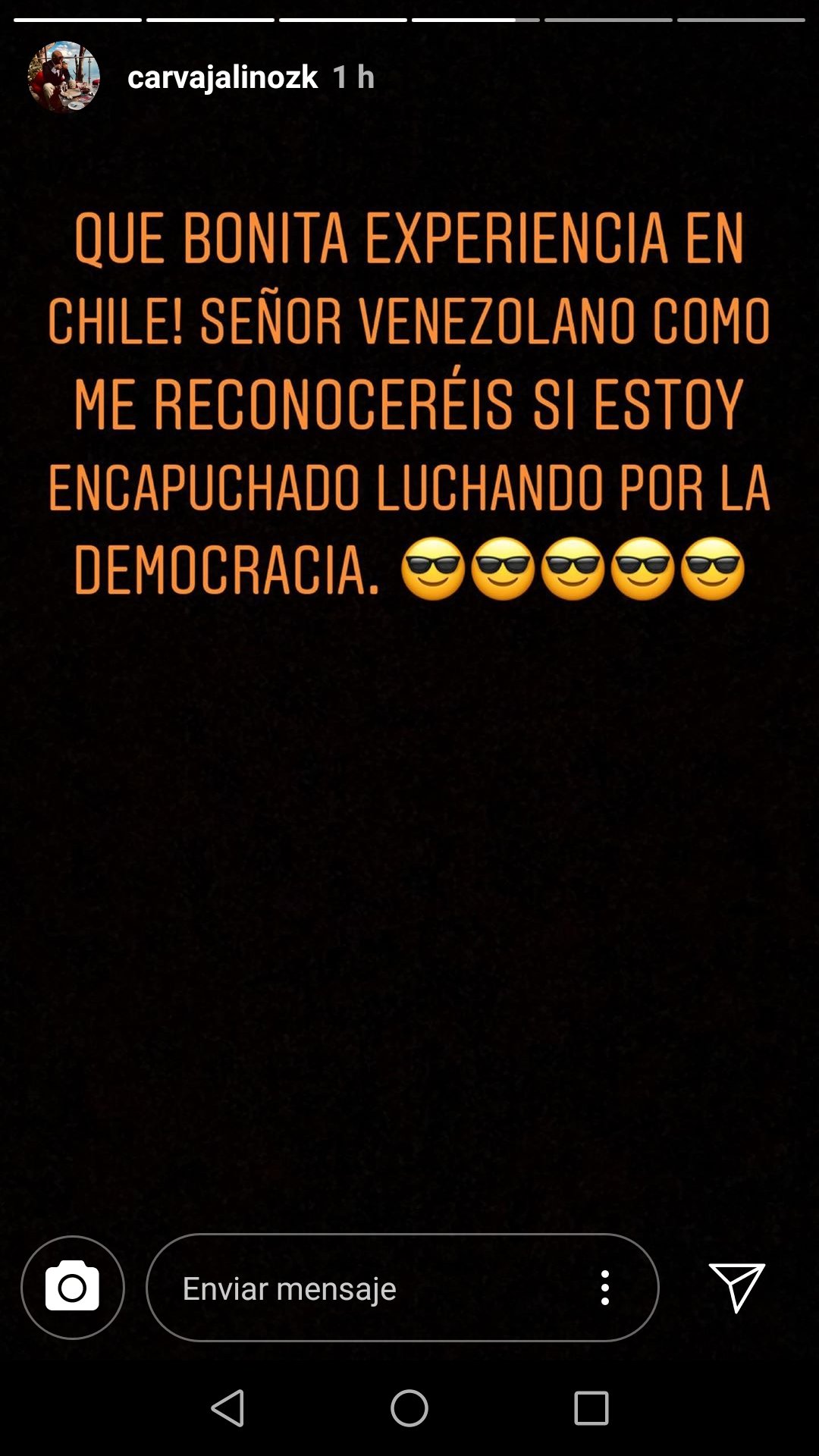 "Que bonita experiencia en Chile! Señor venezolano como me reconoceréis si estoy encapuchado luchando por la democracia".